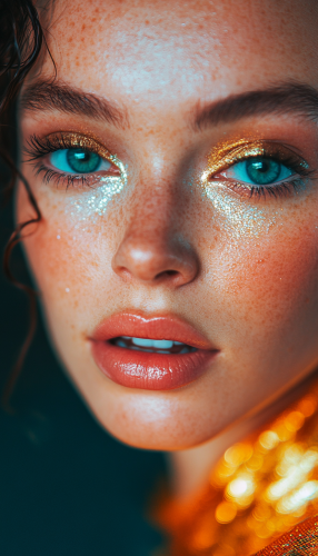 Beautiful blonde woman model with tanned skin 18 years old, with full body in a gitter tattoo thick lips, thick noise, thick eyebrow, closed lips, closed eyes, model, no makeup, no eyelashes, no eyebrows --v 6.1 --s 750 --style raw --ar 9:16