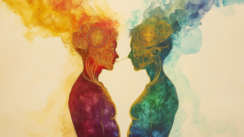 two people communicating by way of energy waves, like flowing lines connecting across from heart chakra to heart chakra, from third eye chakra to third eye chakra, from throat chakra to throat chakra, energy waves flowing between two people facing each other, energy waves flowing from one person to the other across the space between them
