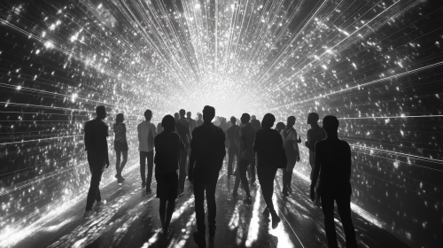 create a photorealistic image of a group of 10 mixed friends, standing together and interacting joyfully in the center of an immersive light beams structure. My friends' faces are clearly visible, capturing their expressions of amazement, laughter, and animated conversation as they move between light beams and engage with each other. The image has a realistic and fashion look, capturing both the vivid details of the friends' expressions and the spectacular show around them. --ar 16:9