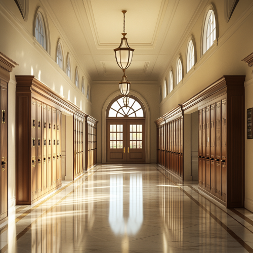 Monarch Academy hallway, gleaming marble floors, tall mahogany lockers, arched windows, streaming sunlight, brass fixtures, cream walls, crown molding, point of view, photorealistic, stunning, 8k, award-winning, dramatic