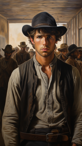 An image of billy the kid with the interior of a salon and people in the background, photorealistic portraits, vintage, --ar 9:16