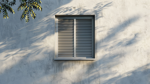 An exterior segment of a house, highlighting a window with a half-descended silver aluminum shutter on a light gray wall. No shutter box in sight. The focus is on the stark simplicity and the shutter's reflective qualities. Created Using: lifelike details, photorealistic rendering, high contrast lighting, reflective metal texture, smooth wall surface, clarity in composition, architectural detail, late afternoon lighting --ar 16:9 --v 6.0