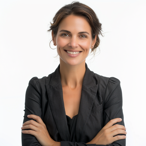 A photorealistic independent Woman 30 to 40 years old, very positiv and smiling infront of a white backdrop, looking very motivated and seems to be very confident in a business casual look, high realistic photo taken in a prffesional Photostudio. very clear and crisp appearance, exposure time 125 sec. to 250 sec. ISO 100 to 200, aperture 8 ,