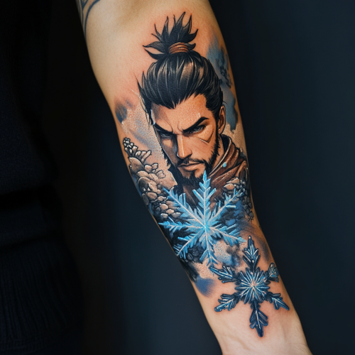 Photorealistic tattoo covering the entire forearm of a Caucasian person, from the elbow to the fingers. The tattoo features Hanzo from Overwatch, depicted in a pose where he is using his ultimate ability. Hanzo is positioned near the elbow, with the ultimate effect extending to the hand, incorporating prominent blue snowflake crystals.