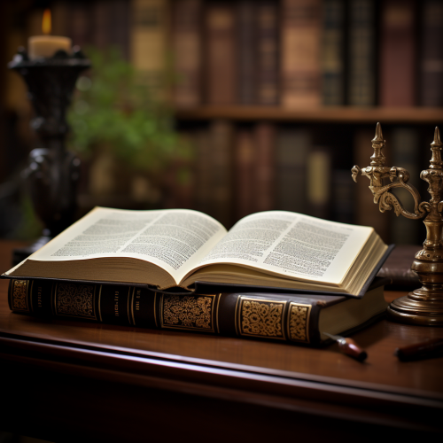 the bible on the desk ready to be studied Shot with precision on a 25mm lens, the image showcases depth of field and tilt blur for a captivating effect. With a shutter speed of 1/1000 and an aperture of F/22, the lighting is balanced beautifully. The carefully calibrated white balance ensures accurate colors in the 32k resolution. Super-resolution techniques enhance intricate details, while the Pro Photo RGB color space adds richness. Lighting techniques like half rear lighting and backlighting create a dramatic atmosphere. . Technical advancements including ambient occlusion, anti-aliasing, and OpenGL shaders refine visual quality. –v 5.2 –style raw –ar 9:16