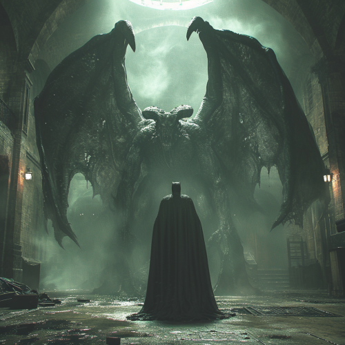 low angle full body view of Cthulhu mythos Batman, night scene, photorealistic, hyperrealistic, depth of field, photography, Cinematic, iso 1200, --v 6.0 --s 750