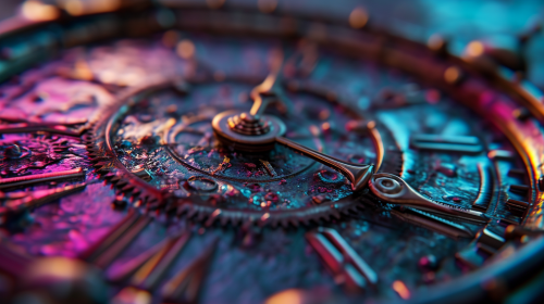 a futuristic analog clock, steampunk, neon purple and blue gradient light, cinematic, moody background, photorealistic, depth of field, --ar 16:9 --stylize 250 --v 6.0