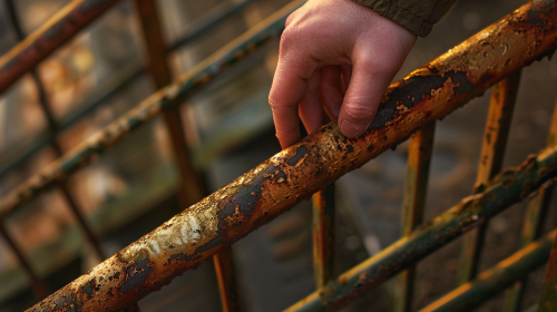 a hand on a rusted handrail, photorealistic, ultrarealistic, cinematic, depth of field, bokeh, close up, --ar 16:9