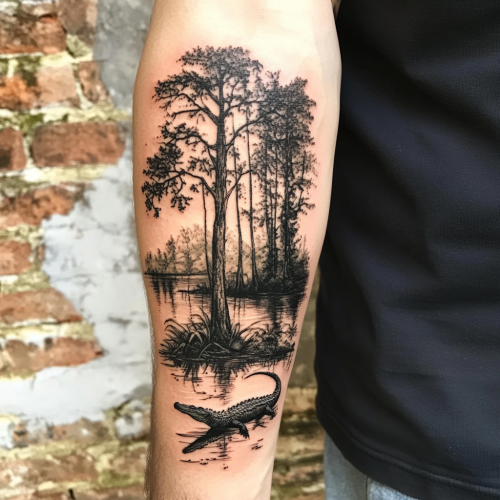 Louisiana swamp design tattoo. Mostly black work with some color. Including Louisiana wildlife. Forearm tattoo. Including a gator on a water bank. Cyprus trees.
