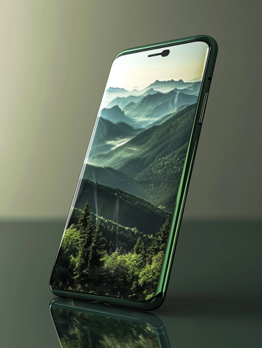 a phone with a negative image of a beautiful mountainside, green colors --ar 3:4 --v 6.0