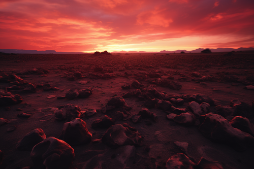 a vast quagmire of claymorities. Stoney landscape, wide angle shot film grain. Eerie red sunset. --ar 3:2 --s 50