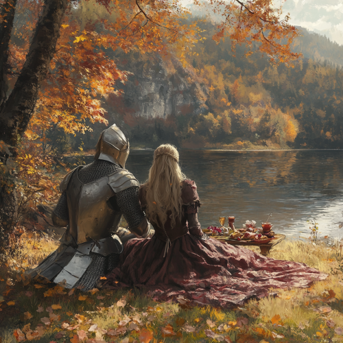 high fantasy style. A Medieval knight and his lady having a picnic beside a lake on a sunny, beautiful fall day. They stare into each other’s eyes lovingly.