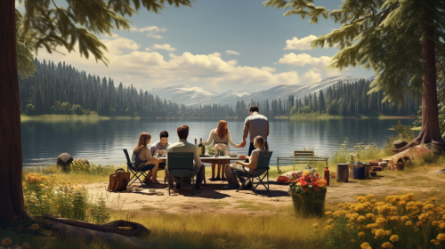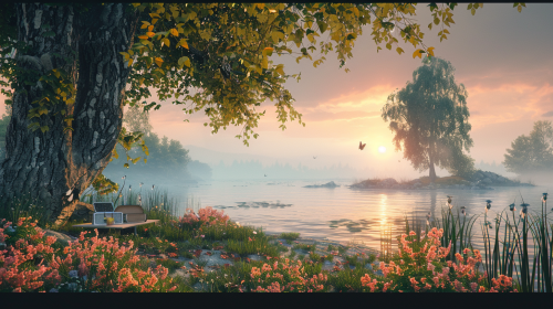 birch lake in western america, dawn, on the shore of the lake there is an oak tree and picnic things are laid out, beautiful setting, butterflies are flying, there are flowers - unreal engine, 4k, high resolution, --ar 16:9 --v 6.0