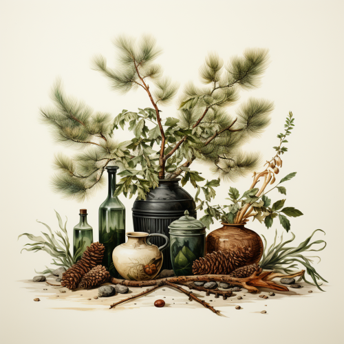 Photorealistic view of small pine tree branches arranged in a vignette style, surrounding the edges of the image with detailed needles, empty space in the center forming a circular shape, background color #336bb8, no pine cones --ar 2:1 --s 250 --style raw
