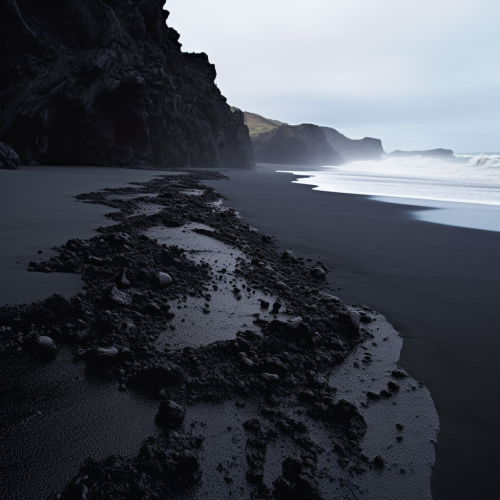 Top view of a black sand beach, aerial view, calm sea, calm waves, pink water, black sand, dreamy, a lonely figure, moonshine, minimalist, simple, purple black background, realistic, photography, wallpaper --s 900 --ar 59:128