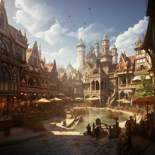 A large medieval D&D city, the entrance is a single large bridge made of white stone, the outskirts of the city are protected by large thick stone walls and towers rise above the walls intermittently, the city rises in elevation the further inward and the back half rises above the rest where a large manor sits