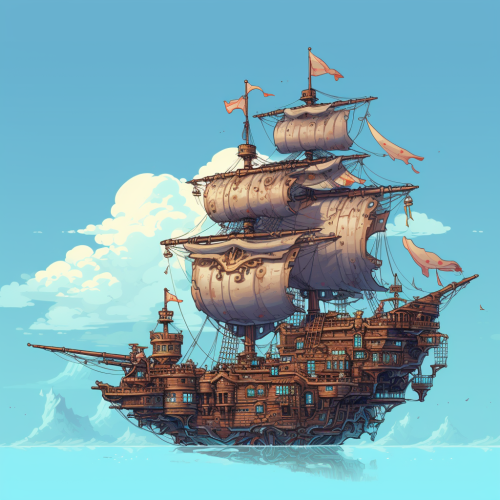 Isometric View of a Whimsical, Simplified but Detailed Cartoon Art Image of a Small-to-Mid Sized Pirate Ship, 15th Century, Animation Model Sheet, --ar 7:5 --niji 6