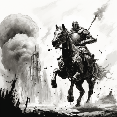 black and white illustration of a naphtha grenade exploding against a mounted crusader knight on horseback