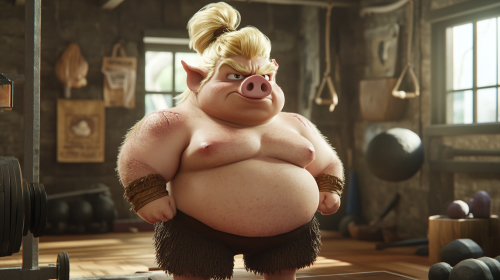 A blonde, heavyset, and unattractive woman with a pig-like face in a sparse gym is wearing a caveman costume. The photo is from the waist up, with her hair tied back and a grumpy expression, in an ultra-realistic cartoon style, in a --ar 16:9