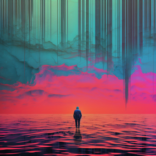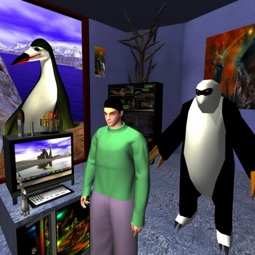 pixelated glitchart of wide-shot of three islands(1st island clothing spread around with clothing rack, second island penguin looking at a computer, third island a robot with a whiteboard), ps1 playstation psx gamecube game radioactive dreams screencapture, bryce 3d --style ddCHhSumaNyOrL1Q --v 5.2