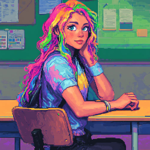 a woke teacher with rainbow hair in a elementary school classroom as a 1981 Nintendo NES video game character pixelated - Variations (Strong) by <@744595798271983626> (fast)