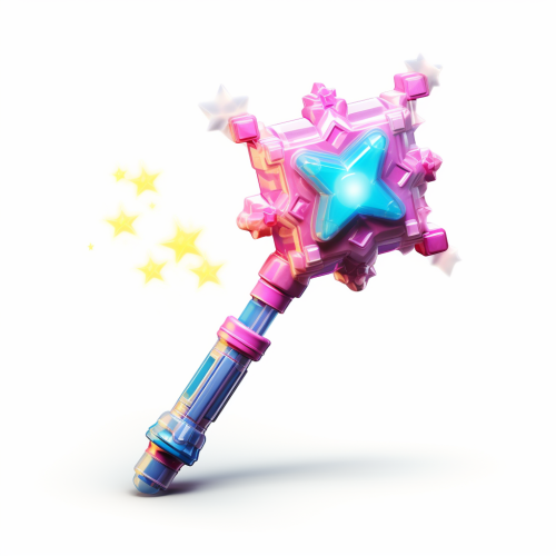 celestial star hammer, pixelated video game weapon. pink, blue, and white body with a light yellow, star shaped hammer head