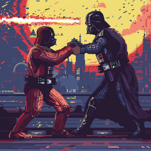 2d video game style. Darth vader punching Rasputin. Pixelated pixel art