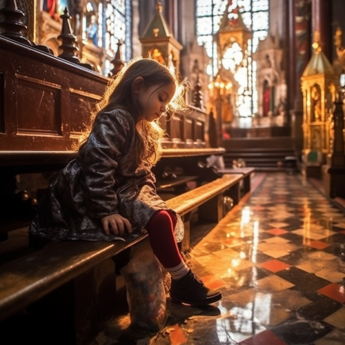 una niña adlocesmte reza de rodilla en un de los bancos de la catedral de lujan argentina. la iglesia esta vacia. en primer termino d ela imagen hay la silueta de cristo crucificado . la luz es tenue .