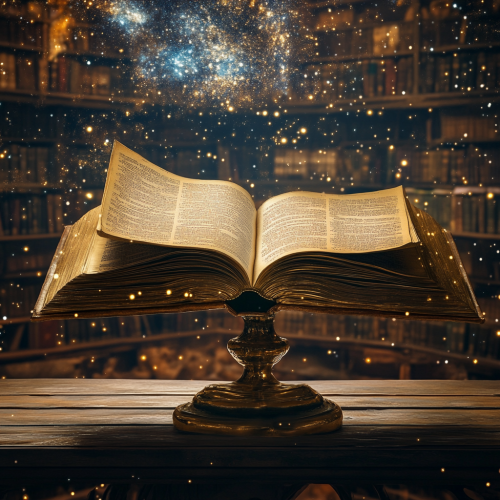 Ashkasic records library with millions upon millions of bookds on shelfvs, within the cosmos, with one open large golden book on a stand with pages open and blank,4k