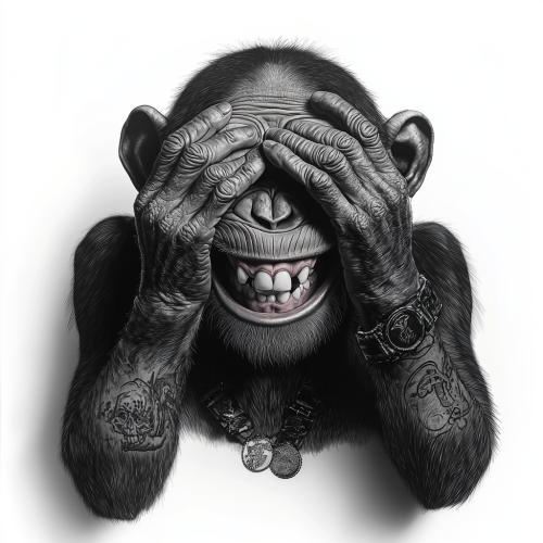 chimpamzee with his hands covering his eyes smiling with joker grin ; realistic lighting; tattoo black and gray realism design; zoom out 2x; isolated on white background with clipping path