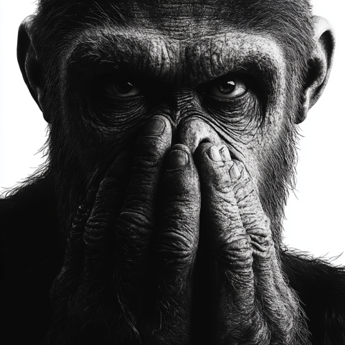 planet of the apes cesar face with his hands covering his mouth; realistic lighting; tattoo realism design, black and gray; isolated on white background with clipping path;--ar 16:9