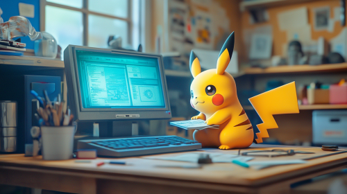 a plastic diorama of a pikachu doing homework in front of a computer in his dorm room. Pikachu is in tears because he really doesn't want to do homework. --ar 16:9