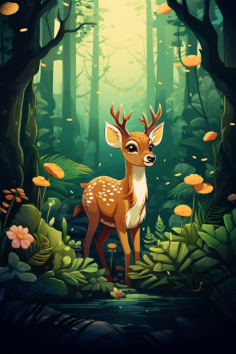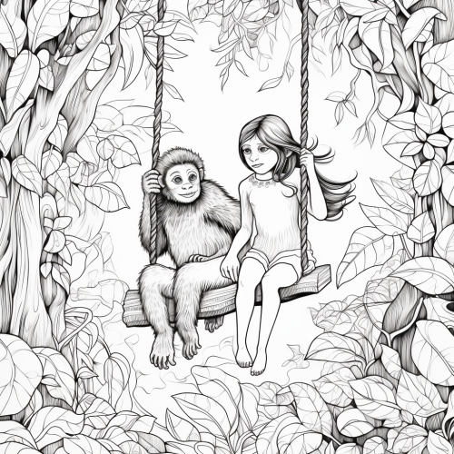 "I’d like a digital illustration depicting a lively jungle scene with lush green foliage and a clear path winding through the trees. In the foreground, there are two small children, one with short blonde hair and the other with curly brown hair, giggling and running along the path. Behind them, a mischievous monkey with a playful expression follows closely, swinging from tree to tree. The sunlight filters through the leaves, casting dappled shadows on the ground. I envision the overall mood to be joyful and adventurous, with vibrant colors and attention to detail."