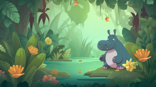 A charming children's game screen with a jungle and hippopotamus theme, featuring intuitive controls, a lovable animated hippopotamus, and interactive jungle elements, creating a visually engaging and delightful gaming experience, Illustration, vector graphics with a focus on simplicity and clarity, --ar 16:9 --v 5.0