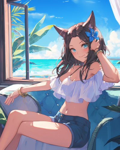 cute attractive neko woman, beach clothes, sat up on sofa, inviting smile, nawr pose, anime cartoon, --niji 6 --ar 4:5