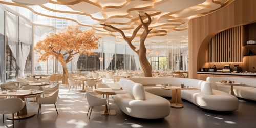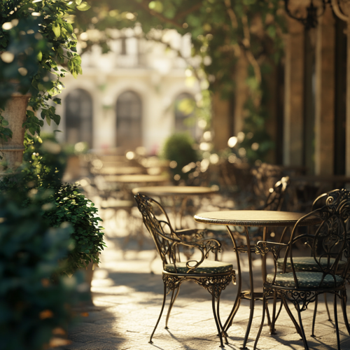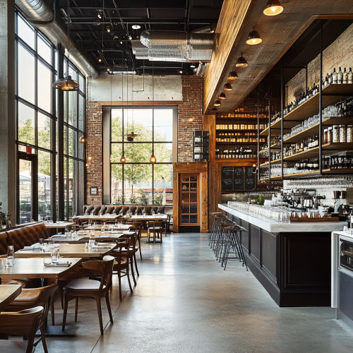 architectural photograph of a restaurant where the architectural concept for this modern European bistro revolves around creating a physical space that marries old-world charm with contemporary design. The idea is to craft an environment where guests feel like they’ve stepped into a thoughtfully modernized slice of Europe, with elements that evoke tradition while embracing a sleek, minimalist aesthetic.
