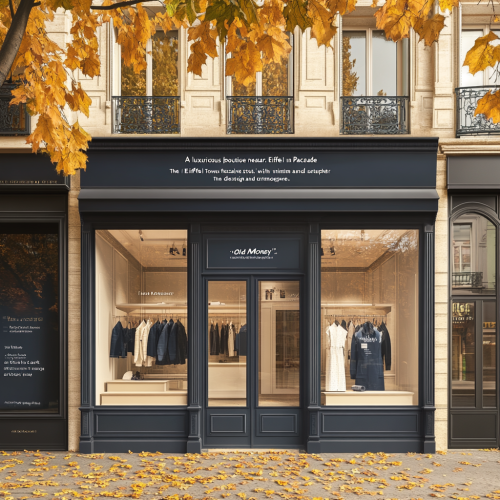 "A luxurious boutique facade near the Eiffel Tower in Paris, set in an autumn atmosphere. The design is minimalistic and creative in an 'Old Money' style, with a color palette featuring a soft cream/light beige as the main tone and a very dark navy as the accent. No visible logo on the facade, emphasizing a clean and understated elegance. Large glass windows reveal a stylish interior showcasing sophisticated clothing. The background includes classic Parisian architecture and autumn leaves, creating a warm and inviting ambiance. Clean lines, refined look, and timeless appeal."