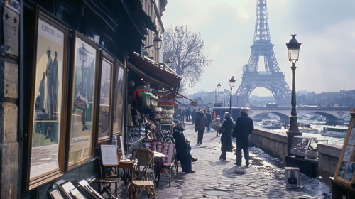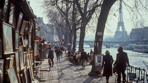 Chic Parisian street scene on April 01, 1974, capturing the cultural vibrancy of the city. The foreground shows Parisians strolling along the Seine, with artists painting and cafes filled with fashionable people. In the background, the Eiffel Tower and classic Parisian buildings are bathed in soft spring light, with posters advertising art exhibitions. The lighting is gentle and warm, reflecting Paris’s timeless elegance and bustling daily life. --ar 16:9 --v 6.0 --style raw