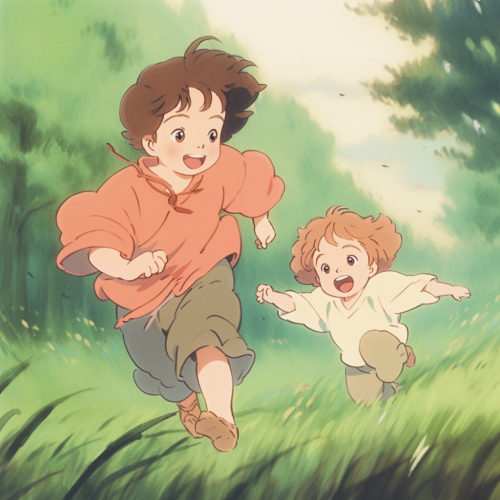 a little girl with curly brown hair holdings hands with a young boy, they are running on grass, 1920s Paris, Hirohiko Araki style, Digital Romanticism , Soft Pastel Palettes , Detailed Backgrounds with Foreground Focus, Dynamic Lighting & Shadows --niji 5 --s 50