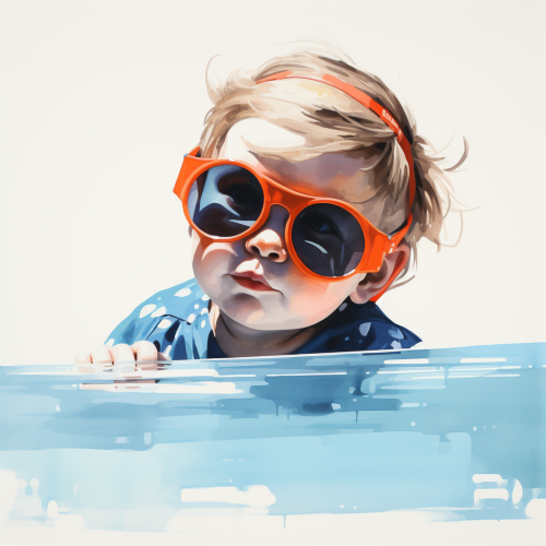 Flat llustration of a baby in a floating tube wearing arm bands and goggles. They are stood facing the viewer, in the style of David Downton