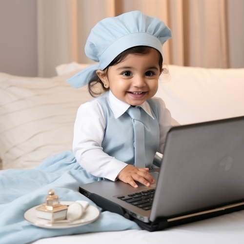 create a cartoon of a 7-months cute Indian baby girl dressed as a Business woman with a laptop, business elements in the background on a white bed sheet background, sitting on the bed, Photoshoot, Studio lighting, top angle shot