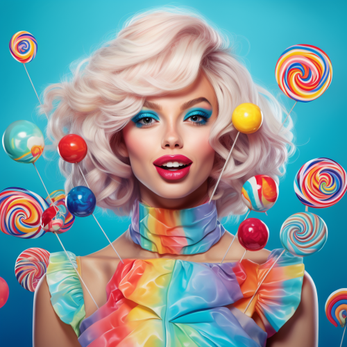Portrait of a beautiful blonde woman who is smiling and winking with one eye. Many colorful lollipops are tangled in her hair. Her clothes are made of lollipops and she is holding a lollipop in her hands. On a blue background