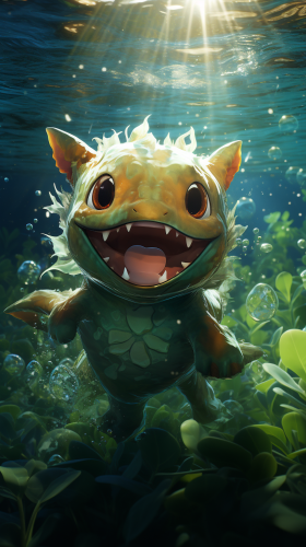 ARTIST: Ken Sugimori IMAGE_TYPE: Cartoon animation | GENRE: Anime | EMOTION: fun, forward thinking, captivating | SCENE: underwater with sunlight coming through, Halloween themed, Pokemon, dynamic shot, vivid colors, full-length, | COLOUR: Blue and Green| SKETCH MODEL Gaomon PD1560 | CAMERA LENSE: 85mm f/1.4 | SPECIAL EFFECTS: Sharp focus | TAGS: lifestyle, 8k, warm, positive, --ar 9:16 --s 600 --v 5.2