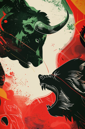 Design a powerful trading poster featuring a fierce bull and an aggressive bear, set against each other in an intense standoff. The bull should be depicted in bold green, representing growth and optimism, with a dynamic, forward-leaning stance. The bear, in contrasting deep red, embodies market fear and resistance, with a defensive and powerful posture. Use a background that includes subtle, abstract trading elements like candlestick patterns, trend lines, and stock symbols to enhance the financial theme. The colors should highlight the symbolism, with vibrant greens and reds, set against a darker, dramatic background, creating an intense visual contrast that represents the battle of market forces. --ar 2:3 --v 6.0