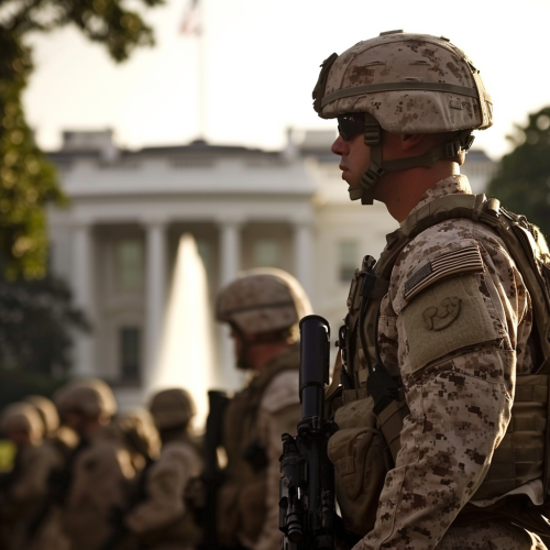 Depict a U.S. political map where every state is shaded in red. The background should have a subtle gradient with patriotic colors--soft reds, whites, and blues--to maintain a balanced yet impactful visual. Ensure both figures stand out while the red map is the centerpiece of the banner. --ar 7:4