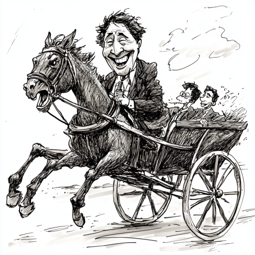 political cartoon black and white, side view, canadian prime minister justin trudeau is laughing on carriage and one tied and thin horse full. hardly able pull him and hardly walking. Few people around him frustrated and tired.