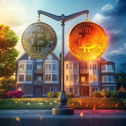Picture a bustling cryptocurrency trading floor, where the air thrums with electric energy. Massive LED screens flash with the latest Bitcoin prices, their constant flux a mesmerizing dance of numbers and symbols. Traders, eyes wide with focus and adrenaline, shout orders and wave their hands, their movements a chaotic ballet of buying and selling. Gleaming Bitcoin logos hover holographically above their heads, casting a golden glow that contrasts with the cool blues and greens of the room. From above, the scene is a whirlwind of activity, a vivid snapshot of the relentless pulse of the Bitcoin market, where fortunes are made and lost in the blink of an eye.