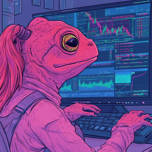 an over the shoulder point of view of a Pinkish red femal frog with a pinkish red skin and reddish pink hair in a ponytail looking at a crypto chart on a computer screen drawn in the style of matt furie with vibrant colors