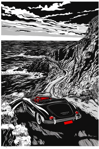 Black-and-white woodcut of a minimalist 1970 Porsche 911 in a racing scene, car in motion with bold outline, simplified racetrack background with tire marks, sense of speed with short diagonal lines near wheels, minimalist racing details like number on door, rough woodcut texture enhancing movement, strong contrast with negative space, vintage racing style --v 6.1 --s 50 --ar 3:4