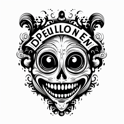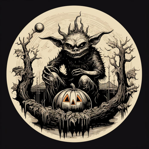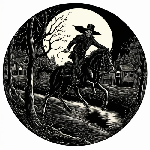 black and white circular lineart woodcut sleepy hollow headless horseman